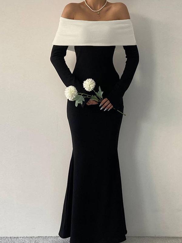 Contrast Color Trim Off Shoulder Long Sleeve Maxi Dress
