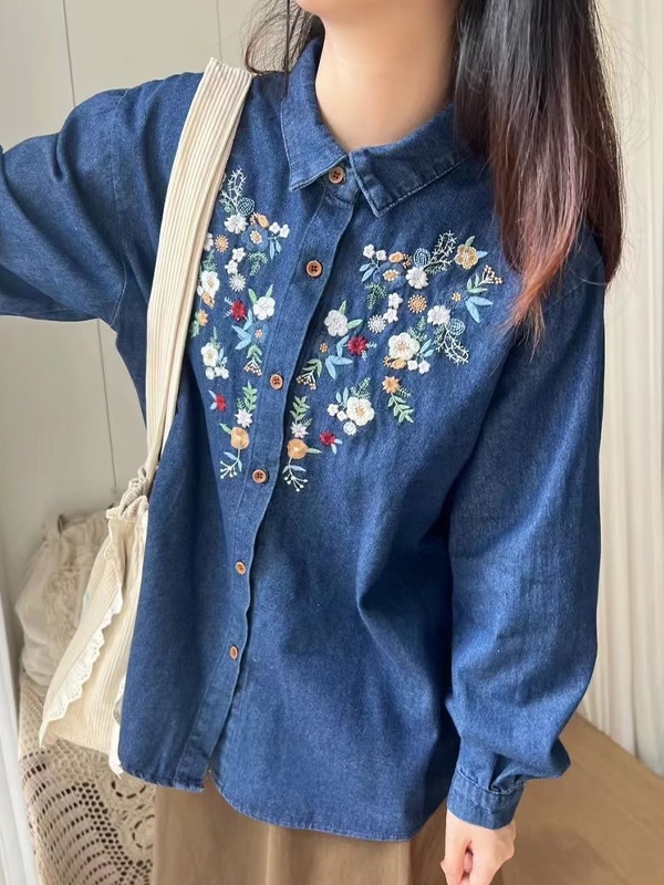 Tribal Flower Embroidery Denim Blouses&Shirts