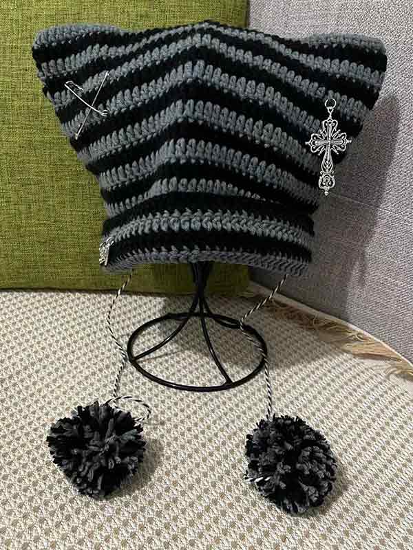 Stripe Cat Design Vintage Pendant Beanie Hat
