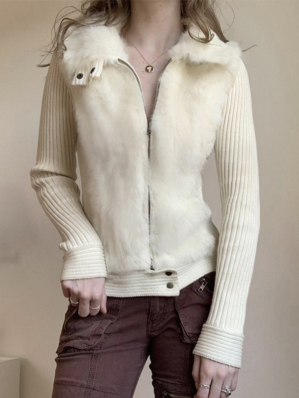 Furry Patchwork Lapel Zippered Waist Cardigan