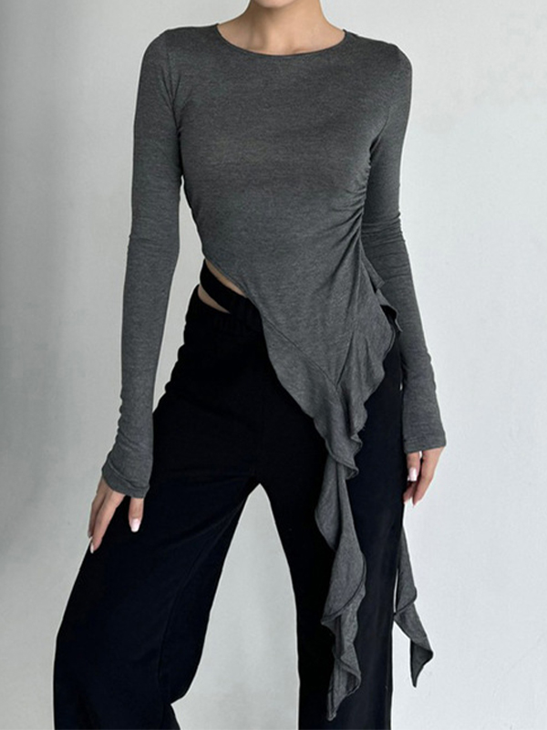 Solid Color Ruffled Long Sleeve Tee