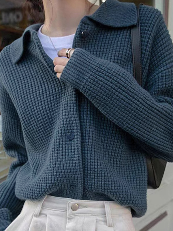 Solid Waffle Lapel Neck Cardigan