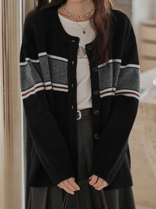 Contrast Stripe Crewneck Loose Cardigan