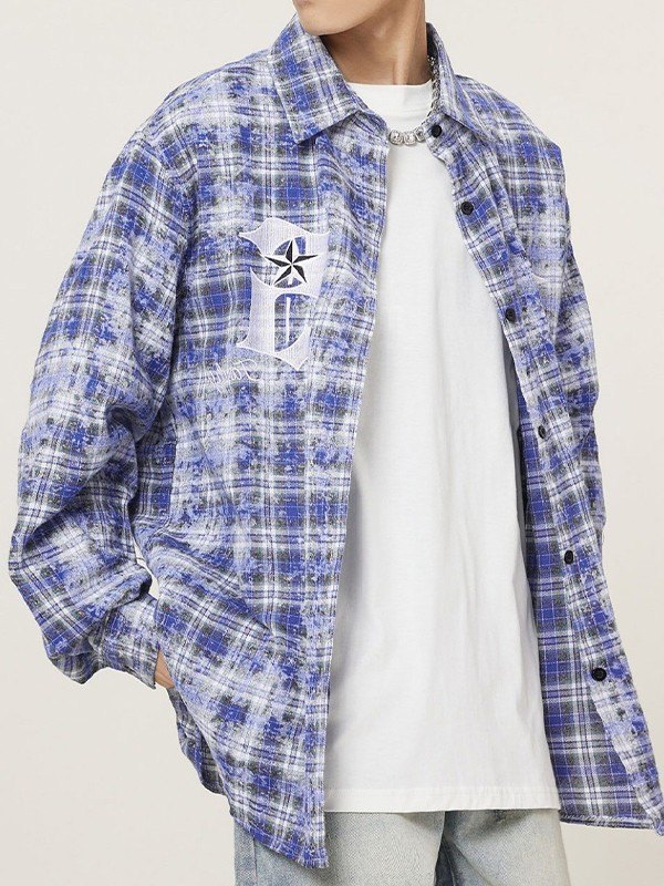 Men’s Embroidered Tie Dye Checkered Long Sleeve Shirt