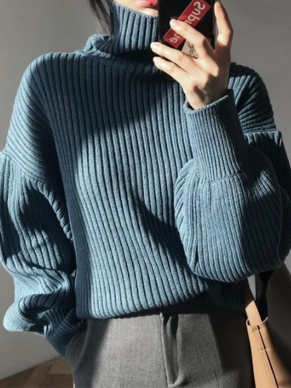 Solid Turtleneck Ribbed Knit Sweater