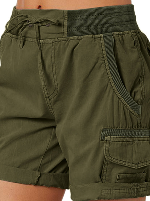 Solid Elastic Waist Multi Pocket Drawstring Shorts