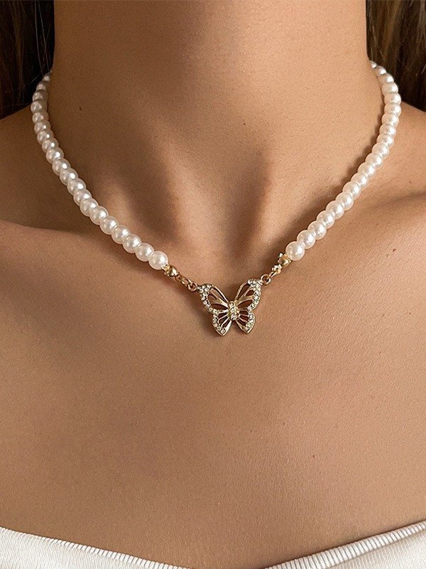 Rhinestone Butterfly Faux Pearl Necklace