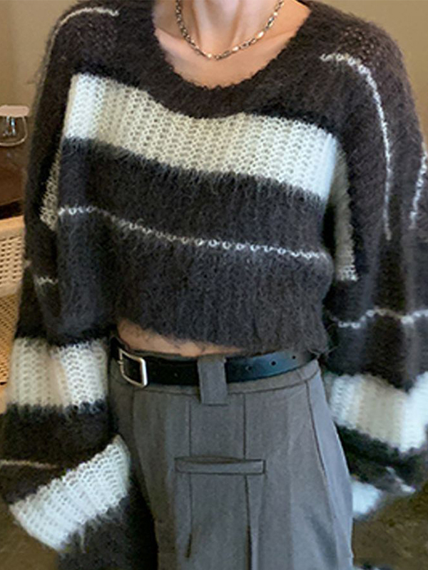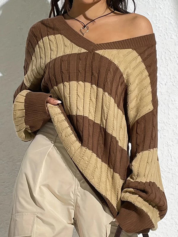V Neck Loose Contrast Stripes Casual Sweaters