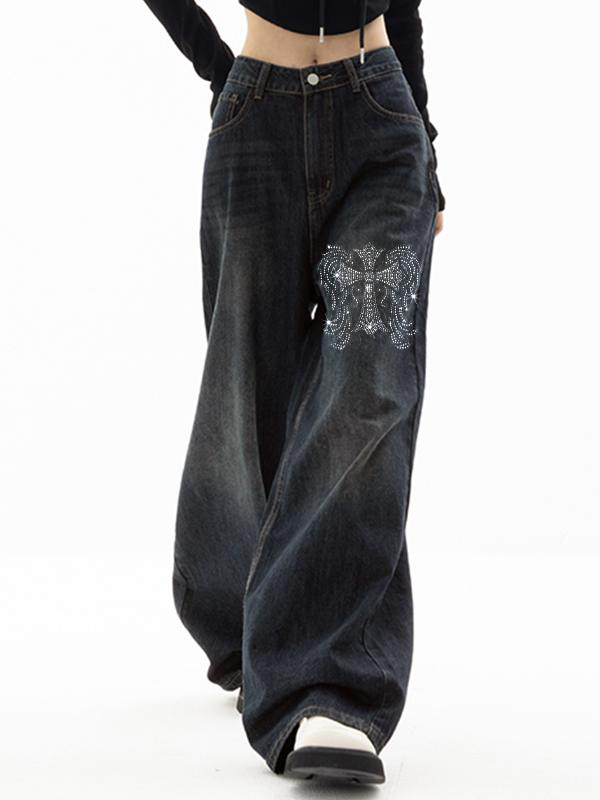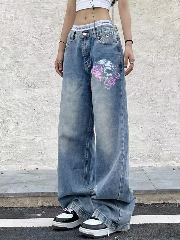 Skull Rose Print Vintage Blue Wide Leg Boyfriend Jeans