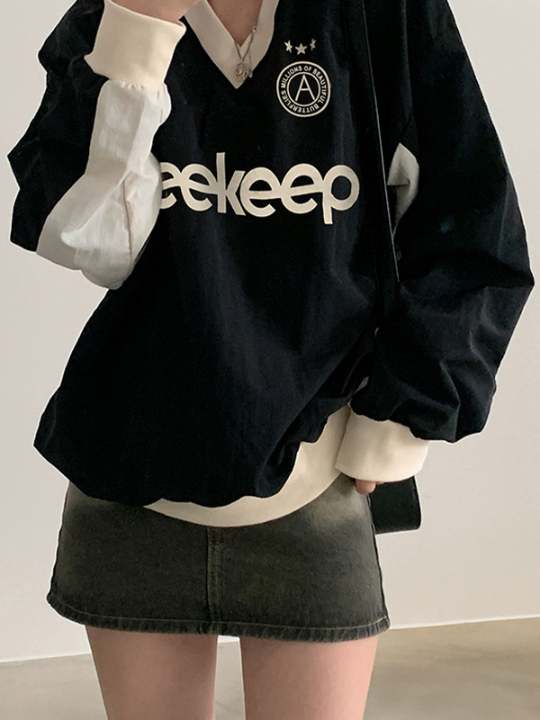 Preppy Contrast Color Letter Print V Neck Sweatshirt