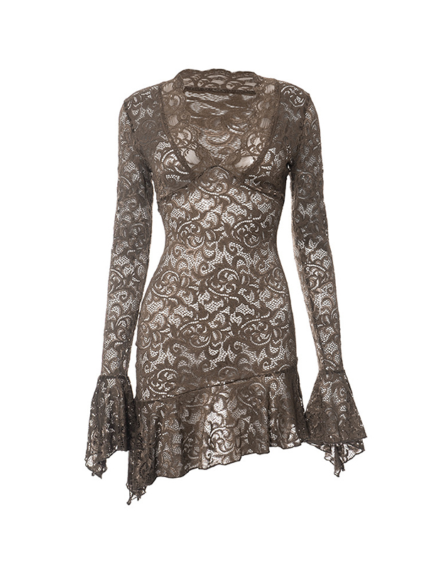 Be the first to review “Lace V Neck Trumpet Sleeve Mini Dress”
