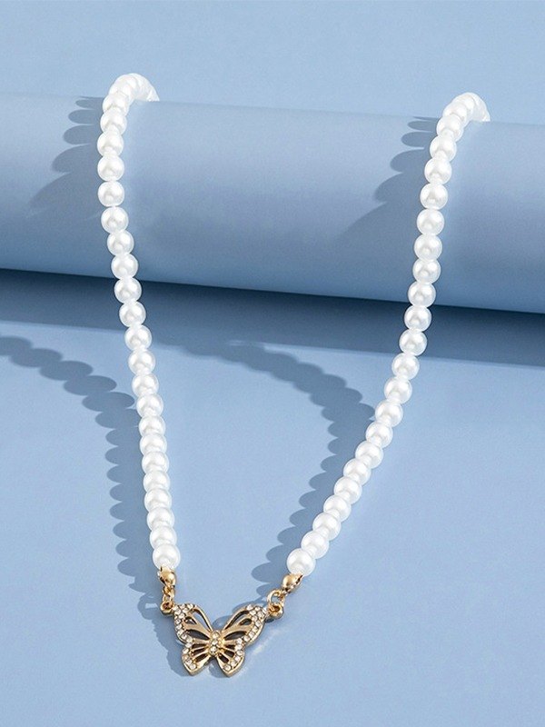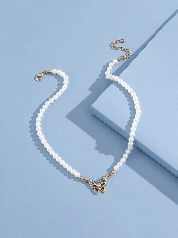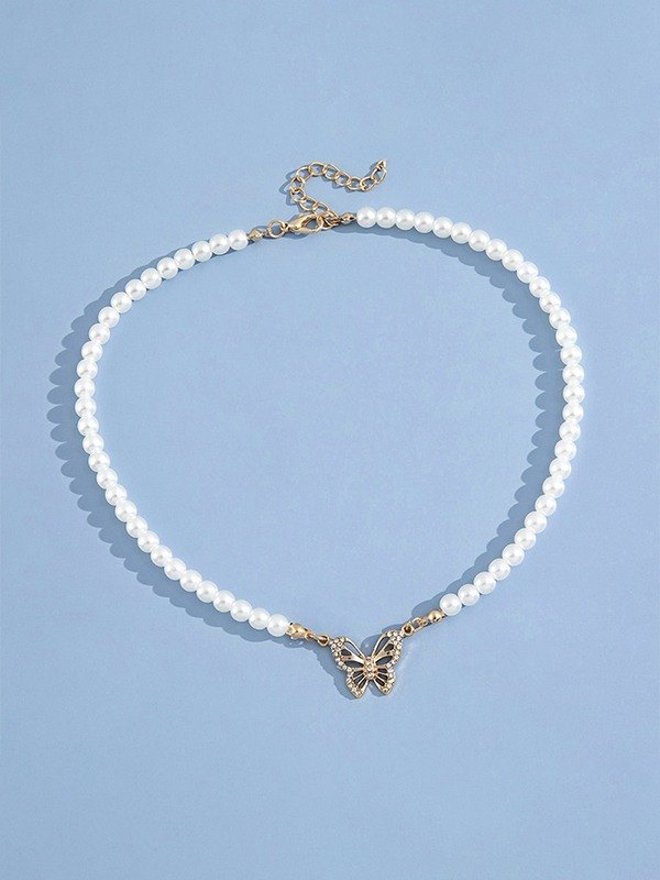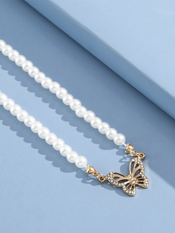 Be the first to review “Rhinestone Butterfly Faux Pearl Necklace”