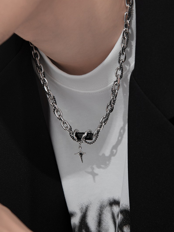 Men’s Double Layered Twine Black Gem Cross Pendant Necklace
